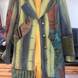 Artistic cape with a blend of green, blue, and yellow. Unique patchwork design. Bold and stylish.