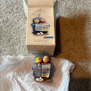 Charming Peanuts Gang ornament by Hallmark. Features characters reading on a blue couch. Perfect for collectors.
