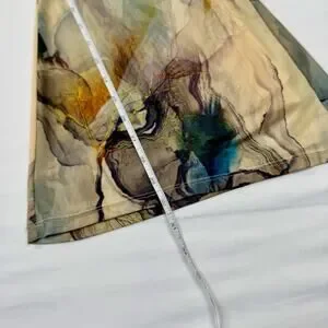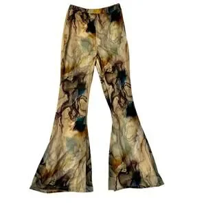 Sheer mesh flare pants featuring an abstract marbled earth-tone print with tan, olive, teal, and golden hues, designed with a mid-rise elastic waistband and dramatic bell-bottom silhouette for a fluid, second-skin fit. Lightweight and semi-transparent with a soft mesh lining at the top, these pants are perfect for layering and statement styling,