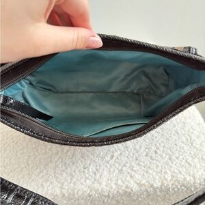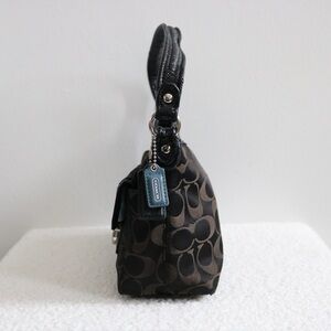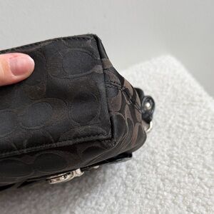 Good condition, has some light wear on the corners and the interior lining has some staining although it has been cleaned. Coach Poppy Sateen Demi Shoulder Bag in Black Signature Jacquard with Silver Hardware. Features double pocket detail on front and patent leather trim. Measurements (not including strap): -10” Long -6” Tall -3.5” Wide