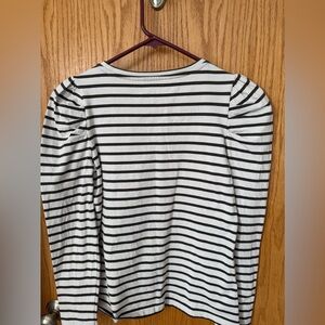 Stylish long sleeve top with grayish/green and white stripes. Little puff sleeve detail keeps this shirt elevated Perfect for versatile wear.