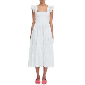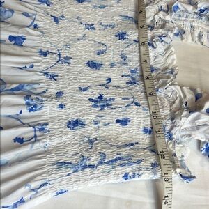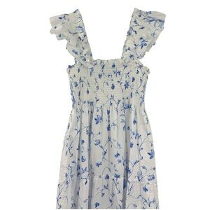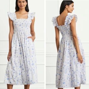 Charming midi dress with blue floral pattern. Features ruffled sleeves and smocked bodice. Perfect for any occasion.