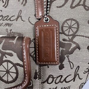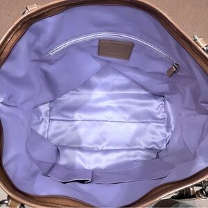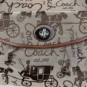 NWOT Coach Horse & Carriage Canvas & Leather Large Tote Bag L0973-F14857. Features a prominent Horse & Carriage Buggy monogram print on a canvas fabric exterior, leather trim and dual leather shoulder straps. Silver metal hardware with a distinctive twist-lock closure on the front exterior pocket. Back slip pocket and multiple interior pockets. Top zip closure. Lavender lilac purple satin lining. Pristine condition.