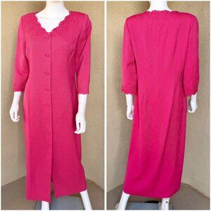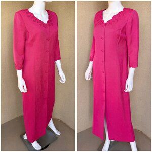 👛This Barbie pink vintage stunner is pure “80s does 60s” perfection, featuring a sleek shift-to-column silhouette with a long hemline, a clean button-front placket, shoulder pads and it’s fully lined. The neckline is a flattering scalloped V-neck with embroidered floral appliqué, paired with 3/4 sleeves finished in matching scalloped embroidery for that extra polished, lady-like moment. Giving Jackie-era charm with an 80s power-pop twist.