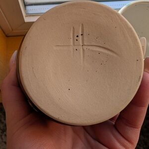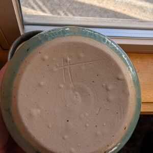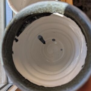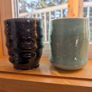 Beautiful set of two pottery cups. One in glossy black and the other in speckled green. Perfect for any kitchen.