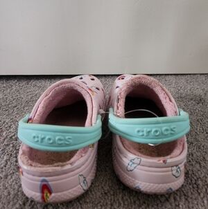 Crocs Baya Lined Printed Clogs in Ballerina Pink with a rainbow and cloud pattern. size 9. Good condition. Some wear on the toes as shown in pictures.