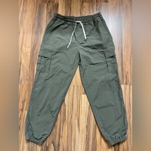 Stylish green cargo jogger pants with elastic cuffs and drawstring waist. Perfect for casual wear.