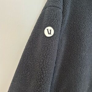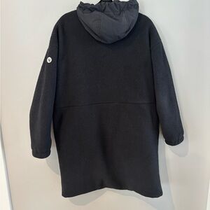 Cozy black fleece jacket with hood. Features button closure and pockets. Ideal for chilly days, great for traveling.
