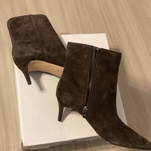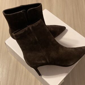 Chic dark brown suede boots. Sleek design with a pointed toe. Ideal for stylish outings.