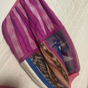 Quilted boho white and pink jacket/coat with colorful woven patchwork bubble sleeves and welt pockets. Tagged Sidney Argaez size small. No closures, a high nick and two front pockets. So fun and bright and cozy! One small dot spot as pictured.