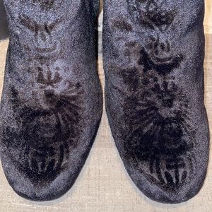 ~Make a statement in these embossed floral crush velvet booties~Block 3 1/2” heel~ 5” shaft~Side zipper closure~Almond toe~