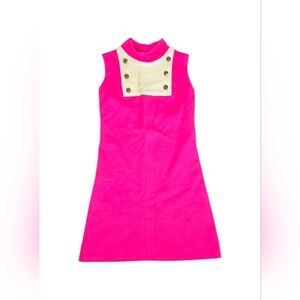 Vintage sleeveless hot pink shift dress with a classic 1960s mod silhouette. Features an ivory contrast bib-style panel with decorative buttons and a back zip closure. Made from pure virgin wool, giving it a structured, tailored feel.