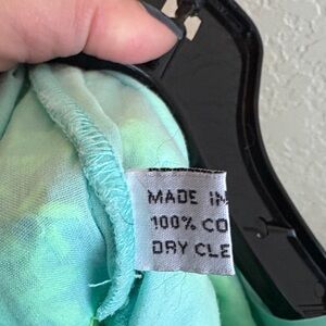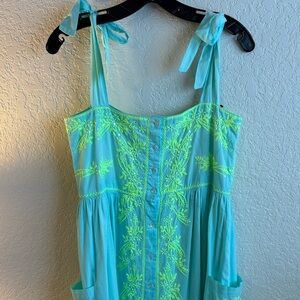 Stylish aqua dress featuring neon green embroidery and tie straps.