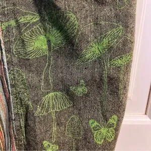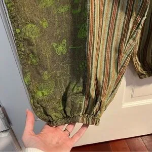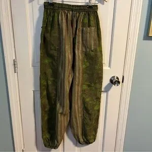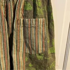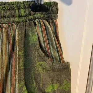 Flawless condition 100% cotton lantern pants with a drawstring pull on elastic waist. Brand is Siddhartha and is made in Nepal. Fun mushroom and stripe print. No size tag - measures as a small. 27” inseam, 15” rise, 13” unstretched flat waist.