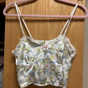 Embrace a delicate look with this floral camisole top. Featuring a charming lace trim and a soft floral pattern, it's perfect for a casual day out. The pastel colors add a touch of elegance to your wardrobe.