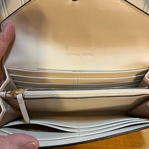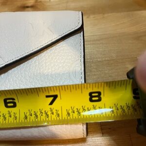 Brand New, I bought it for my sister for her birthday however she informed me she doesn’t use wallets anymore! It’s gorgeous, light cream, comes with original tags still attached. Plenty of room inside and you could put a chain on it and use it as a wallet crossbody. Has gold tone snap. Retail $298.00. 7.5 X 4”