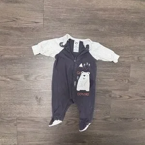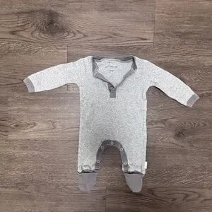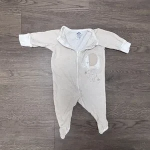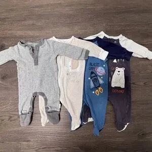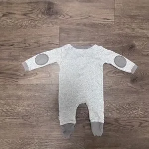 Wish my newborn could have worn more- the time flies!! Charming set of footies in gray, cream, and blue. Burt’s Bees Footie is buttoned and has the cutest elbow patches. Gerberx3 are full zip with elephant, bear and space graphics. Soft and comfortable for little ones. In gently worn condition.