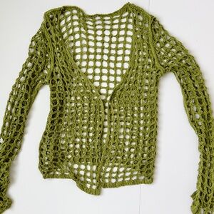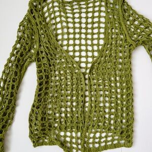 Stylish green crochet women’s open-knit sweater/ cardigan. Summer beach vacation. Resort wear bohemian. Perfect for layering. Size large