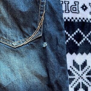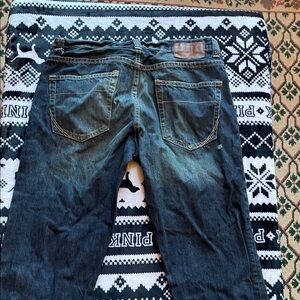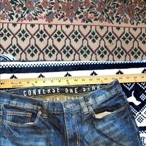 Indigo slim straight jeans. Features classic pocket style. Made with quality denim. Size 32x32. Has small flaw. Can be seen in 4th photo