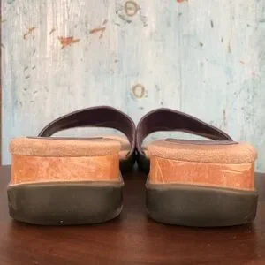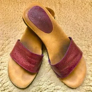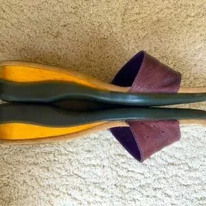Deep purple/eggplant colored ostrich leather slide sandals from Brazil. The sole is very well cushioned making them very comfortable. Heel measures 1-3/4.” The color goes with many more things than one would think. Gently worn. Size 8