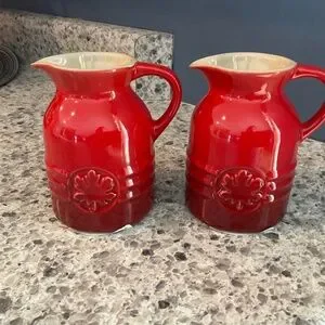 LeCreuset Syrup Jars in the color Cerise. 4” high holding 6 ounces each. These are discontinued currently.