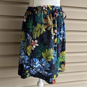 This is a bright, eye-catching skirt from Ann Taylor LOFT, ladies size Small. The woven fabric, 100% polyester, is a vibrant botanical floral print on a deep navy background. Features a comfortable elastic waistband and adjustable drawstring tie for an easy pull-on fit, and hidden in-seam pockets. The lightweight woven fabric drapes beautifully, making it perfect for warm weather, vacations, or casual everyday wear. A fun yet polished piece that pairs effortlessly with a simple tee, tank, or lightweight sweater - this will be a welcome addition to your wardrobe!