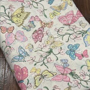Vibrant fabric with a butterfly print. Features pink, yellow, blue, and green butterflies on a cream background. Perfect for crafting or sewing projects. 44in x 6yds.