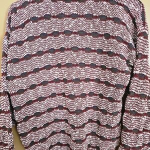 Cozy knit sweater with burgundy and white stripes. Perfect for casual wear.
