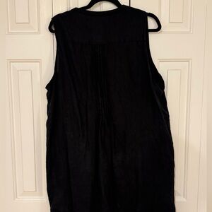 Chic black, linen tunic with mother-of-pearl button-up front. Sleeveless design for versatile styling. Has pockets. Worn and washed multiple times but in very good condition.