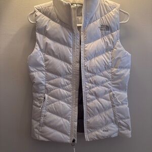 Gently used The Northface 550 women’s xs white puffer vest. Small loose thread below logo as pictured; no other staina or rips