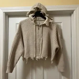 Cozy knit cardigan with a hood. Features a zip front and frayed hem. Perfect for layering.