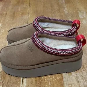 Stylish UGG mules with plush lining. Tan suede with red accents. Perfect for casual wear.super comfortable and very warm your feet will be happy and you happy too!