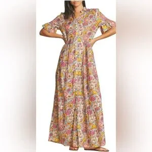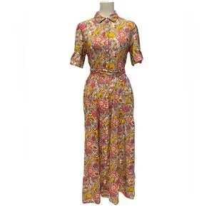 Vibrant floral maxi dress with a matching belt. Features a button-up front and short sleeves.