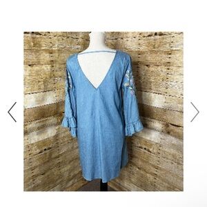 Flying Tomato plus size dress in size 1X featuring beautiful floral embroidery across the chest and sleeves. Lightweight chambray-style fabric with a lace-up neckline and tassel ties for an effortless boho look. Ruffle bell sleeves, sleeve cutout detail, and a flattering relaxed silhouette. Deep V-back with strap detail adds a unique touch. Perfect for spring, summer, festivals, country concerts, or casual everyday wear.