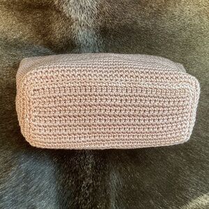 Pinkish mauve colored knit design heart bag with a full zipper top close. Fully lined interior with a zipper pocket and slip pockets. Great red heart design on the front. Super fun design and could be used as a clutch or makeup bag. Made by The Sak.