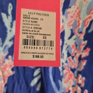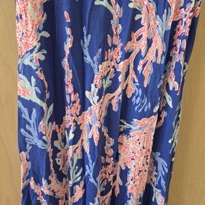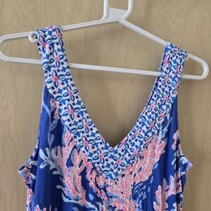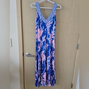 Brand new blue and pink printed midi dress by Lilly Pulitzer. V-neck and sleeveless. May stretch to fit a S or M. Retails for $198.
