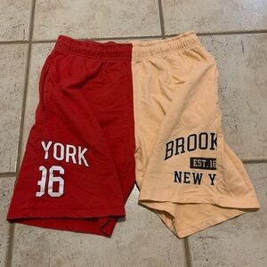 These eye-catching shorts feature a bold, split color-block design, perfect for making a statement! One leg is a vibrant Red/Maroon with the printed graphic "YORK 86" and the other is a soft Beige/Tan with the graphic "BROOKLYN EST. NEW YORK".