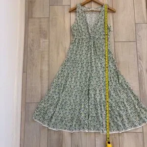 V-Neck Midi Dress in a green, white, and yellow floral pattern