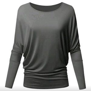 LIKE NEW. COMFORTABLE TUNIC STYLE TOP. THIS TOP FEATURES GATHERING ON THE SIDES AND DETAILED SLEEVES. THE COLOR IS A YUMMY CHARCOAL. GREAT WITH LEGGINGS, PANTS AND SKIRTS!