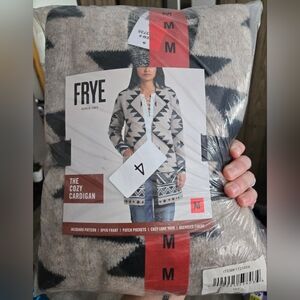 This is the FRYE Women's The Cozy Cardigan in a tan (or oatmeal) and black jacquard pattern. Key features include an open front, patch pockets, and construction from a "cozy luxe yarn" blend that includes recycled fibers.
