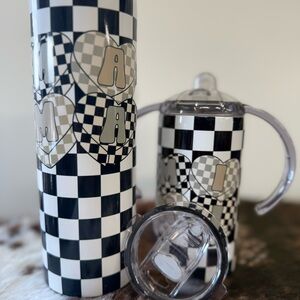 Stylish checkered tumbler set with heart design. Includes two tumblers with lids.