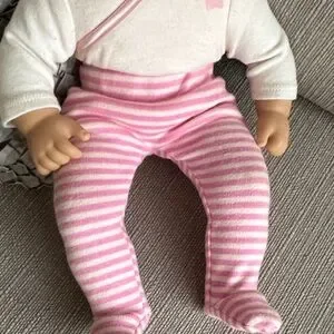 Charming doll with a soft white and pink outfit. Ideal for imaginative play. In excellent condition with very light wear. Only noticeable on the head. Shown in last photo.