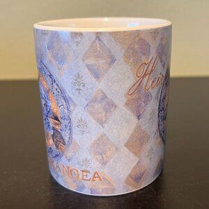 Artwork by Elizabeth King Brownd featuring lovely bouquets of blue Heirloom Hydrangea in oval frames against a diamond patterned wallpaper pattern in hues of blue, violet, gray, and gold wraparounds this ceramic Lang and Wise Collector Mug. Gold text reads, HEIRLOOM HYDRANGEA. An small image of an oval framed bouquet of blue Heirloom Hydrangea peaks out from the white interior below the rim. From LANG & WISE “Heirloom Hydrangea” EKB #3; circa 2002. Dishwasher and microwave safe. Measures 4” tall with a 3” diameter; 5” across including handle. Holds 12 fluid oz.