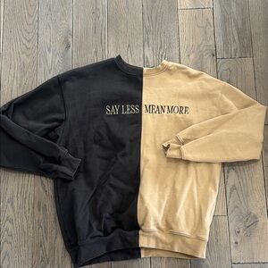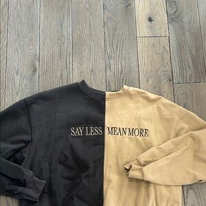 Elevate your style with this two-tone sweater featuring a bold 'Say Less Mean More' design. Perfect for casual outings, this black and tan sweater offers both comfort and a statement look.