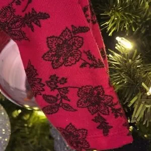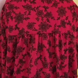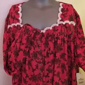 Elegant red pajama dress with black floral pattern. Features lace trim. Comfortable and stylish for sleepwear.