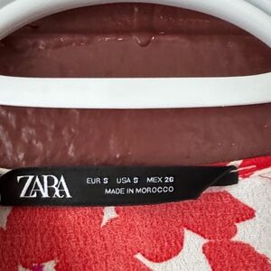 Chic Zara dress with red floral design. Wrap dress featuring a fully connected skirt. Has hem gathered 3/4 sleeves.