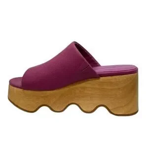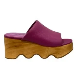 Keywords: Charlotte Stone Truman clogs, magenta leather mule, wooden platform clog, chunky retro shoes, 70s platform mules, statement slip on clog, designer comfort shoes, bold purple clogs, festival style footwear, elevated casual shoes.