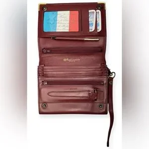 This Le Tierce leather wristlet/clutch is vintage made and from Paris, France, NWT. As the sticker says, “Fabrique de Petite Maroquinerie de Luxe,” means “a luxury small leather goods factory.” They specialize in handcraft production of high-end accessories. This wristlet/clutch features front gold-tone corner guards, a horse’s head, similar to Cartier (this is NOT Cartier!). It has a gold-tone clip wrist attachment, an opening in the back for a credit card and an interior that fits multiple items!