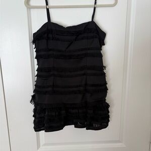 Chic black mini dress with a fitted silhouette. Features delicate straps and a ruffled hem. Perfect for a night out.