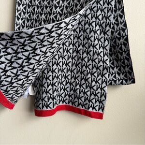 Michael Kors scarf featuring the iconic all-over MK monogram. Designed in a classic black and grey color palette with a bold red trim for a modern accent.